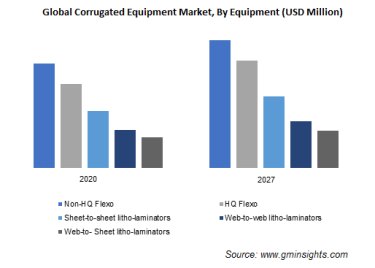 The food & beverage industry is a major consumer of paperboard-based corrugated packages that are printed using flexographic printing machines. They are commonly used for packaging juices, milk, and cereal products. Moreover, paperboards generally outperform plastic materials in terms of light blocking properties. Paperboard packaging includes diverse physical formations such as blister backings, solid-fiber boxes, folding cartons, trays, set-up boxes, fiber drums, and convoluted & spiral-wound cans. The increasing consumption of such packaging is expected to bolster the corrugated equipment market sales for corrugated machines by 2027.