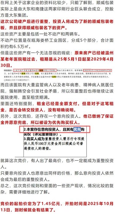 近日在阿里资产交易网站上,出现了一则“温州顺威包装有限公司关于确定重整投资人”的竞价公告,以1.45亿的价格起拍。