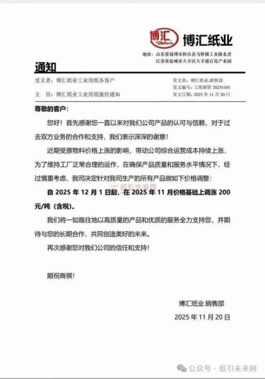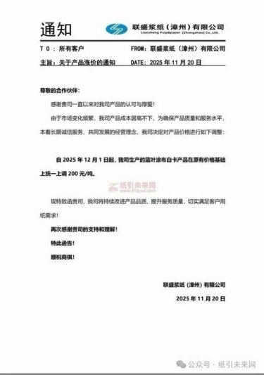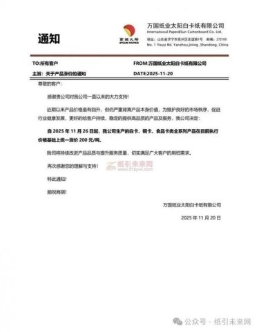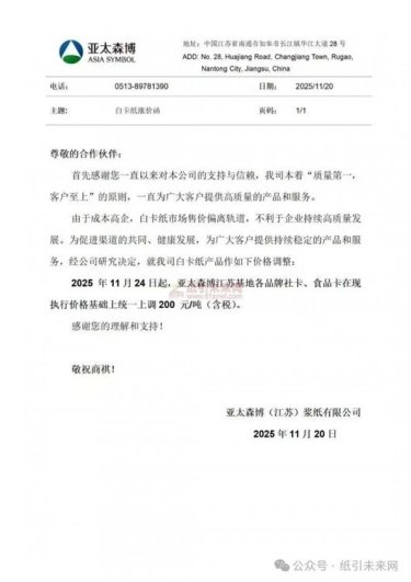 自 2025 年11月26日起,我公司生产的白卡、铜卡、食品卡类全系列产品在目前执行价格基础上统一涨价 200 元/吨。