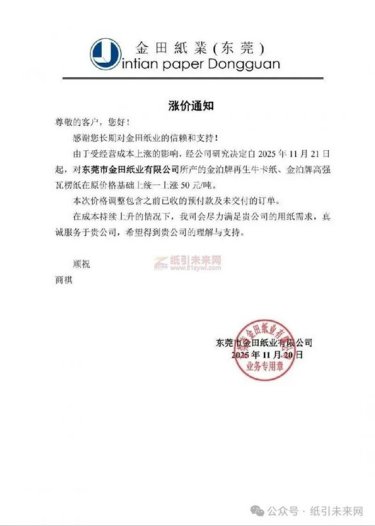 自2025年11月21日起,对东莞市金田纸业有限公司所产的金泊牌再生牛卡纸、金牌高强瓦楞纸在原价格基础上统一上涨50元/吨。