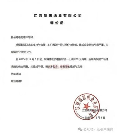 江西晨阳纸业:自 2025 年12月1日起,现将原纸价格暂时统一上调 200元每吨,后期再根据市场情况随时做出调整。