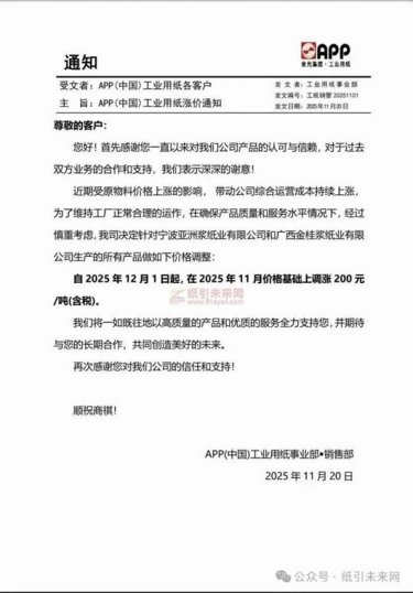 APP(中国)工业用纸事业部:自2025年12月1日起,在2025 年11月价格基础上调涨200元/吨(含税)。
