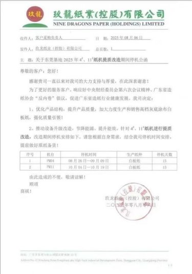 造纸龙头玖龙纸业(02689.HK)和理文造纸(02314.HK)响应广东省造纸协会的“反内卷”倡议,接连发布停机函和涨价函,将造纸行业“反内卷”推到聚光灯下。