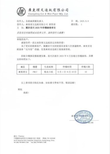 进入7月以来,多个纸种价格进一步下滑,叠加“反内卷”热潮持续升温,玖龙纸业、理文造纸宣布停机并涨价,被解读为率先应对这轮降价冲击,浙江一家头部纸企人士受访时也坦言,“前阵子造纸内卷太厉害了,好多品种纷纷降价,估计(我们)公司也会有相应行动。”