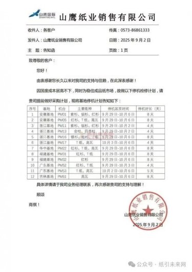 为保障生产设备稳定运行、优化生产节奏,山鹰纸业旗下六大基地确定了停机时间,具体安排为9月29日至10月6日。此次涉及停机的基地包括安徽基地、浙江基地、华中基地、福建基地、广东基地以及吉林基地