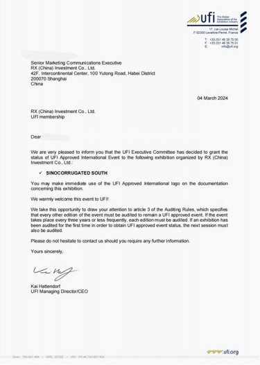近日,励展博览集团有好消息传来!继其主办的中国国际瓦楞展于2019年获得国际展览业协会(UFI)资格认证后,华南国际瓦楞展今年也获得了UFI的资格认证,代表华南国际瓦楞展也进入国际顶尖展览会行列!